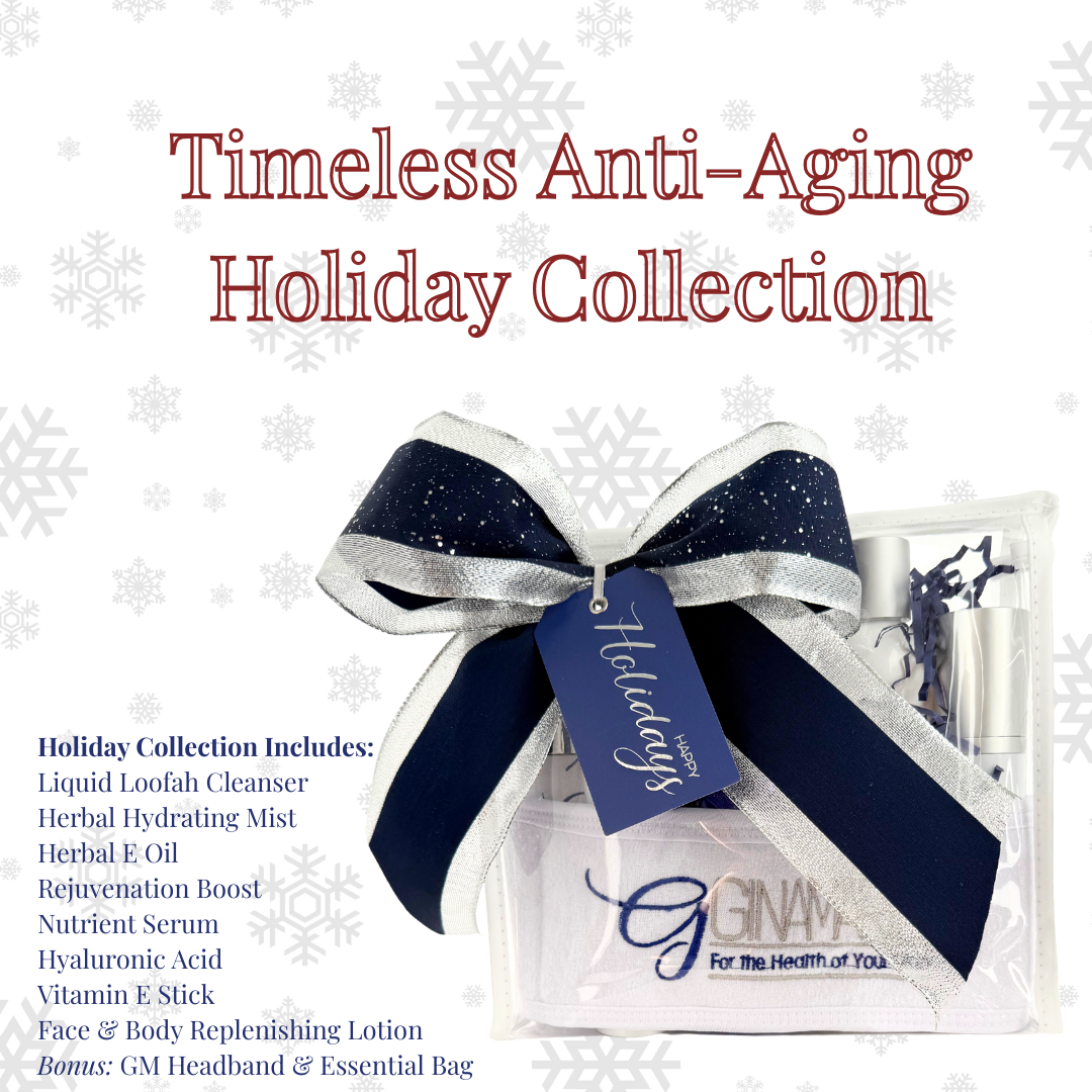 Elevate her skincare routine with the Timeless Holiday Anti-Aging Collection. This refined collection combines cleansing, hydration, and rejuvenation with a full range of essentials— Cleanser, Herbal E Oil, Hydrating Mist, Rejuvenation Boost, Nutrient Serum, Hyaluronic Acid, Vitamin E Stick, Face & Body Lotion, plus a complimentary Essential Skincare Bag and GM Headband—designed to restore radiance and fight the signs of aging.
